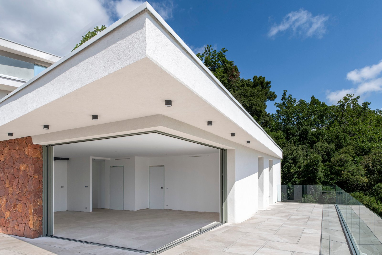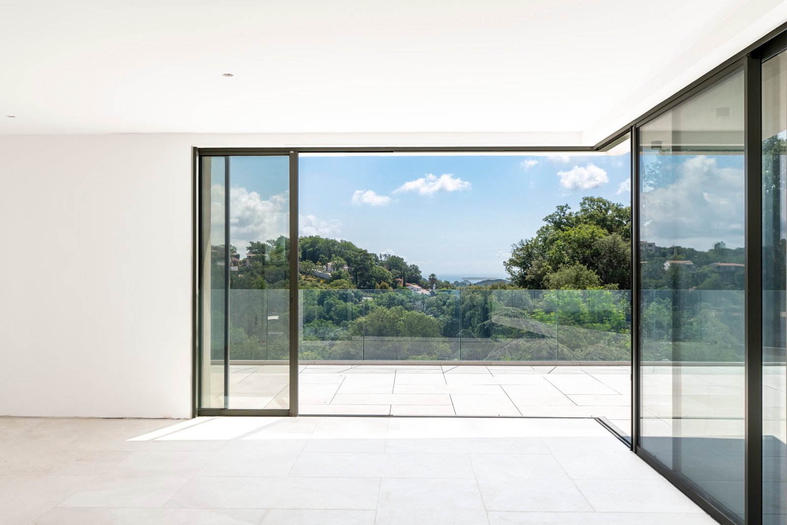 Les grandes baies vitrées à galandage s’ouvrent totalement et sont pourvues de double vitrage anti-effraction avec un filtre réfléchissant apportant à la fois une protection solaire et une réelle intimité intérieure.