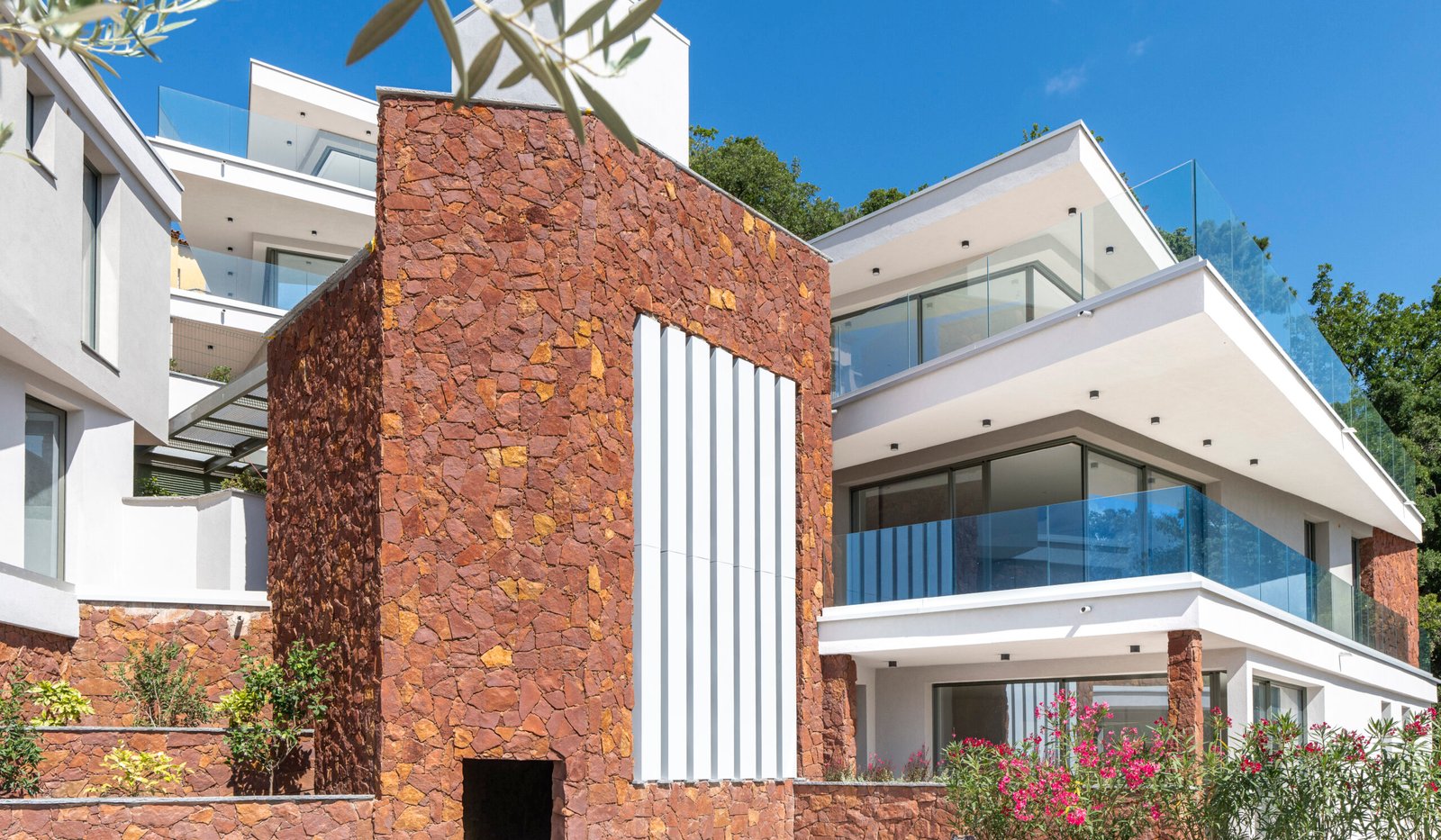Son architecture contemporaine parfaitement intégrée à son environnement, se trouve renforcée par l’utilisation de parement en pierres naturelles aux couleurs du Massif et de menuiseries extérieures minimalistes en aluminium de couleur gris mousse.